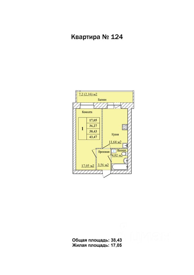 Продаётся 1-комнатная квартира в строящемся доме (дом 7), срок сдачи: II-кв. 2026, общей площадью 38.43 кв.м., на 1 этаже.