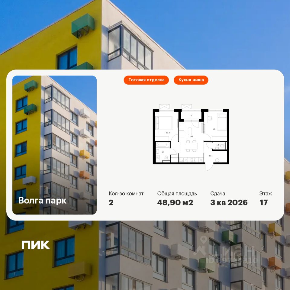 Продаётся 2-комн. квартира площадью 48,9 кв.м на 17 этаже 17 этажного дома (Корпус 1В, Секция 1) проекта ПИК Волга парк. Светлый просторный подъезд на уровне земли, функциональная планировка, большие окна, c отделкой. Жилой комплекс ''Волга парк'' расположен в 15 мин. езды от центра Ярославля во Фрунзенском р-не на правом берегу Волги. В проекте предусмотрено 18 жилых корпусов, две школы и 3 детских сада. Квартиры с нейтральной отделкой, подъезды с высокими потолками, панорамными окнами и двумя входами на уровне земли без ступеней и пандусов. В каждом дворе будет зелень, места для отдыха, детские и спортивные площадки. На первых этажах готовых домов открыта автошкола, мебельный и цветочный магазины, студия красоты, паб, по мере сдачи корпусов появится больше товаров и услуг. В непосредственной близости находится 4 детских сада, школа, поликлиники, торговый центр ''Фреш'' , фитнес-клубы. В 15 минутах ходьбы расположены крупные гипермаркеты ''Лента'' и Metro, а также благоустроенный парк Судостроителей. Артикул 975907 (Застройщик ООО ''РУСБИЗНЕСИНВЕСТ'')