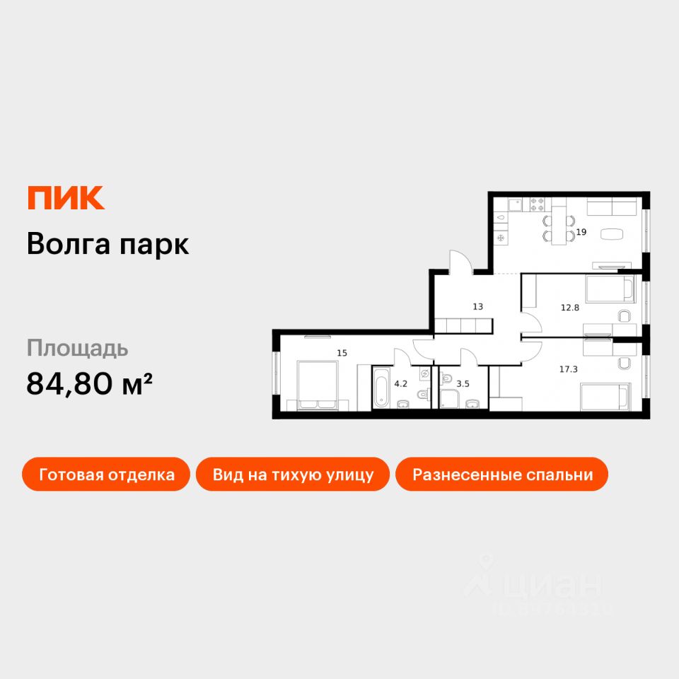 Продаётся 3-комн. квартира площадью 84,8 кв.м на 1 этаже 17 этажного дома (Корпус 1В, Секция 2) проекта ПИК Волга парк. Светлый просторный подъезд на уровне земли, функциональная планировка, большие окна, c отделкой. Жилой комплекс ''Волга парк'' расположен в 15 мин. езды от центра Ярославля во Фрунзенском р-не на правом берегу Волги. В проекте предусмотрено 18 жилых корпусов, две школы и 3 детских сада. Квартиры с нейтральной отделкой, подъезды с высокими потолками, панорамными окнами и двумя входами на уровне земли без ступеней и пандусов. В каждом дворе будет зелень, места для отдыха, детские и спортивные площадки. На первых этажах готовых домов открыта автошкола, мебельный и цветочный магазины, студия красоты, паб, по мере сдачи корпусов появится больше товаров и услуг. В непосредственной близости находится 4 детских сада, школа, поликлиники, торговый центр ''Фреш'' , фитнес-клубы. В 15 минутах ходьбы расположены крупные гипермаркеты ''Лента'' и Metro, а также благоустроенный парк Судостроителей. Артикул 975619 (Застройщик ООО ''РУСБИЗНЕСИНВЕСТ'')