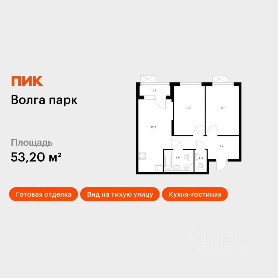 Продаётся 2-комн. квартира площадью 53,2 кв.м на 17 этаже 17 этажного дома (Корпус 6Б, Секция 2) проекта ПИК Волга парк. Светлый просторный подъезд на уровне земли, функциональная планировка, большие окна, c отделкой.