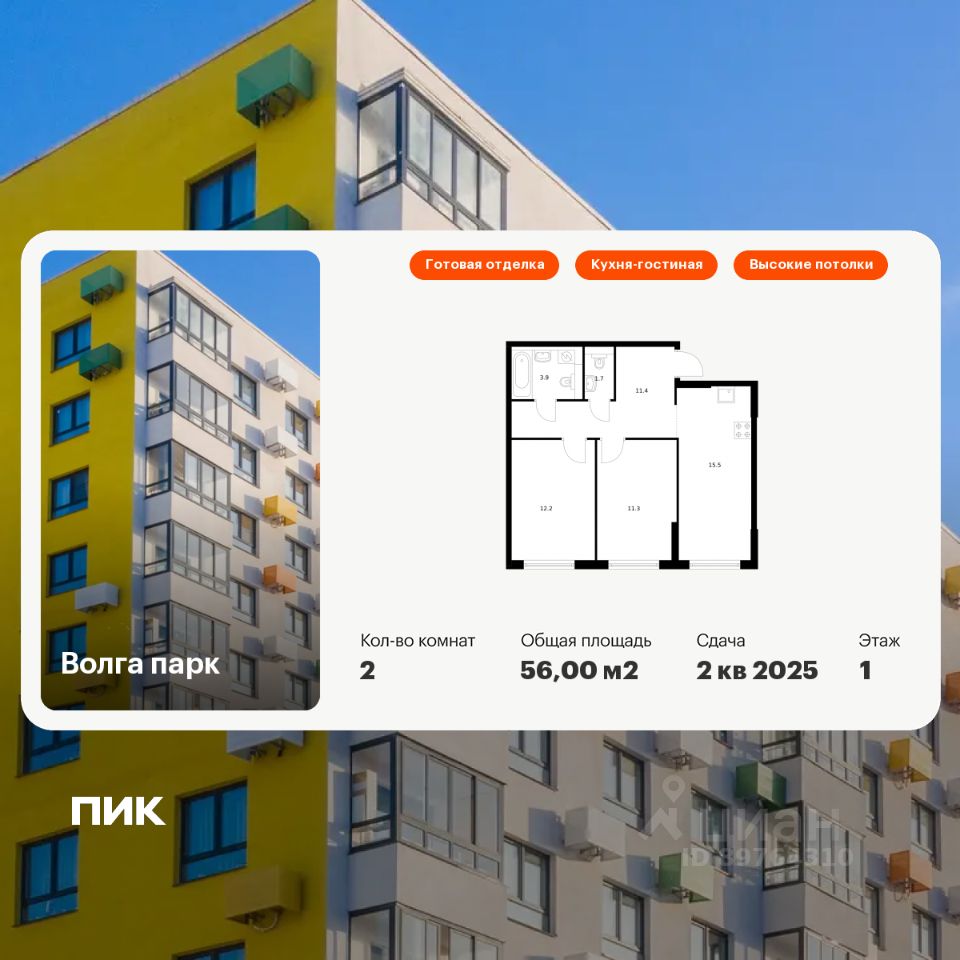 Продаётся 2-комн. квартира площадью 56 кв.м на 1 этаже 17 этажного дома (Корпус 6Б, Секция 2) проекта ПИК Волга парк. Светлый просторный подъезд на уровне земли, функциональная планировка, большие окна, c отделкой.