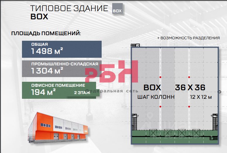 Общие параметры склада: площадь одного здания 1498 кв.м. производственно-складская зона: 1340 м2 офисная зона: 160 м2 нагрузка на пол: 5 т/м2 ворота подъемно-секционные: 4 шт.