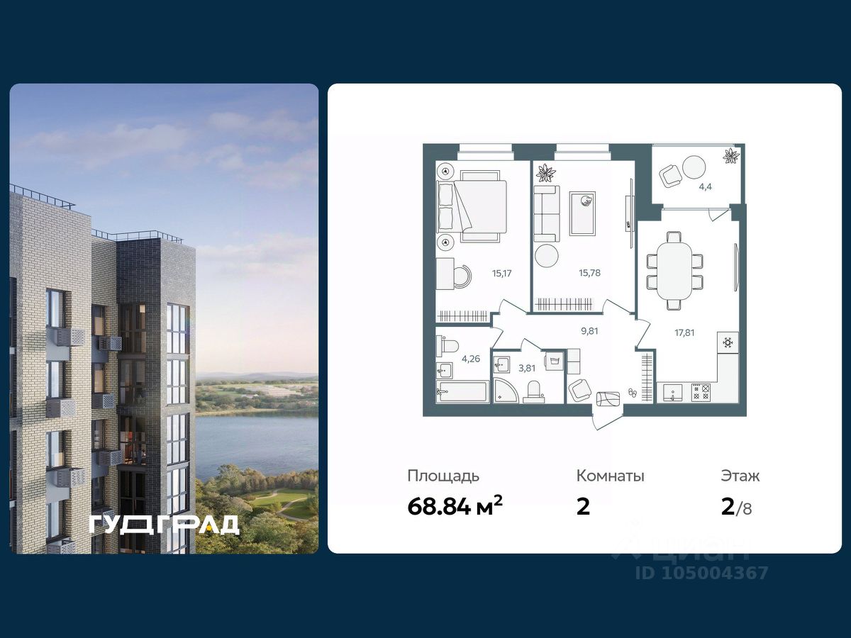 Продаётся 2-комнатная квартира в строящемся доме (Дом 2), срок сдачи: III-кв. 2026, общей площадью 68.84 кв.м., на 2 этаже. При планировании участка применена концепция ''двор без машин''.Внутренняя часть двора -благоустроенная территория для занятий спортом, отдыха, игр. В каждой секции дома предусмотрены проходные подъезды, через которые жители дома будут попадать и на дворовую территорию и к дорогам и парковкам, расположенным с внешней стороны. Вход в подъезды с уровня земли. Каждый подъезд дома имеет лифт грузоподъемностью 630 кг. При разработке планировок квартир применяется зарекомендовавшая себя на практике концепция квартиры с большой комнатой, включающей в себя зоны гостиной, кухни и столовой. Эта комната является своеобразным аналогом общественного пространства для членов семьи. Спальни и детские комнаты запроектированы меньшего размера, но с полным учетом всех необходимых функциональных зон и сценариев. Таким образом в каждой, даже однокомнатной квартире есть обособленные дневное общественное и ночное приватное пространства. В цокольном этаже дома будут устроены кладовые помещения для хранения площадью от 5 до 15 кв.м. Попасть в кладовую можно из подъезда. Кладовые предназначены для хранения крупногабаритных вещей: автомобильных покрышек, лыж, санок, велосипедов, детских колясок. Собственная кладовая поможет вам разгрузить вашу квартиру от сезонных вещей, и использовать лоджию и свободное пространство квартиры для уютного отдыха , а не для хранения крупногабаритных вещей. На фасадах домов будут смонтированы короба для установки наружных блоков кондиционеров.
