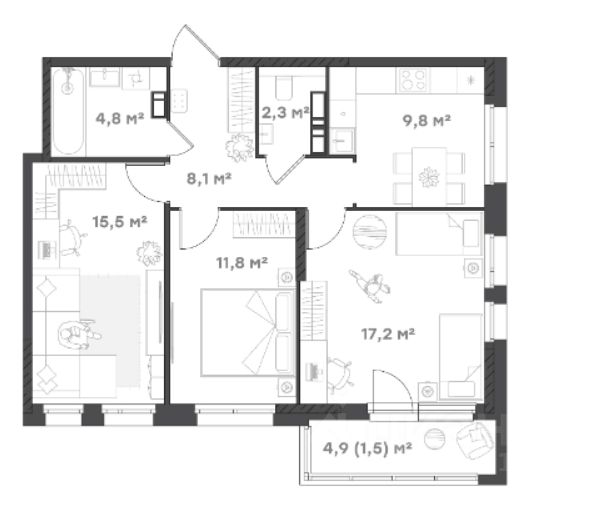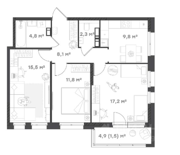 - Просторная 3-комнатная квартира (71 м²) в современном доме (15/18 этаж)