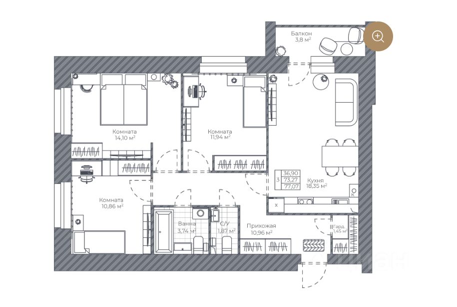 — Удачная планировка: три уютные спальни 14 кв. м., 12 кв. м. и 11 кв. м. , кухня-гостиная площадью 18,35 кв. м. с выходом на застеклённый балкон. — Просторный санузел — есть место для стиральной машины.
