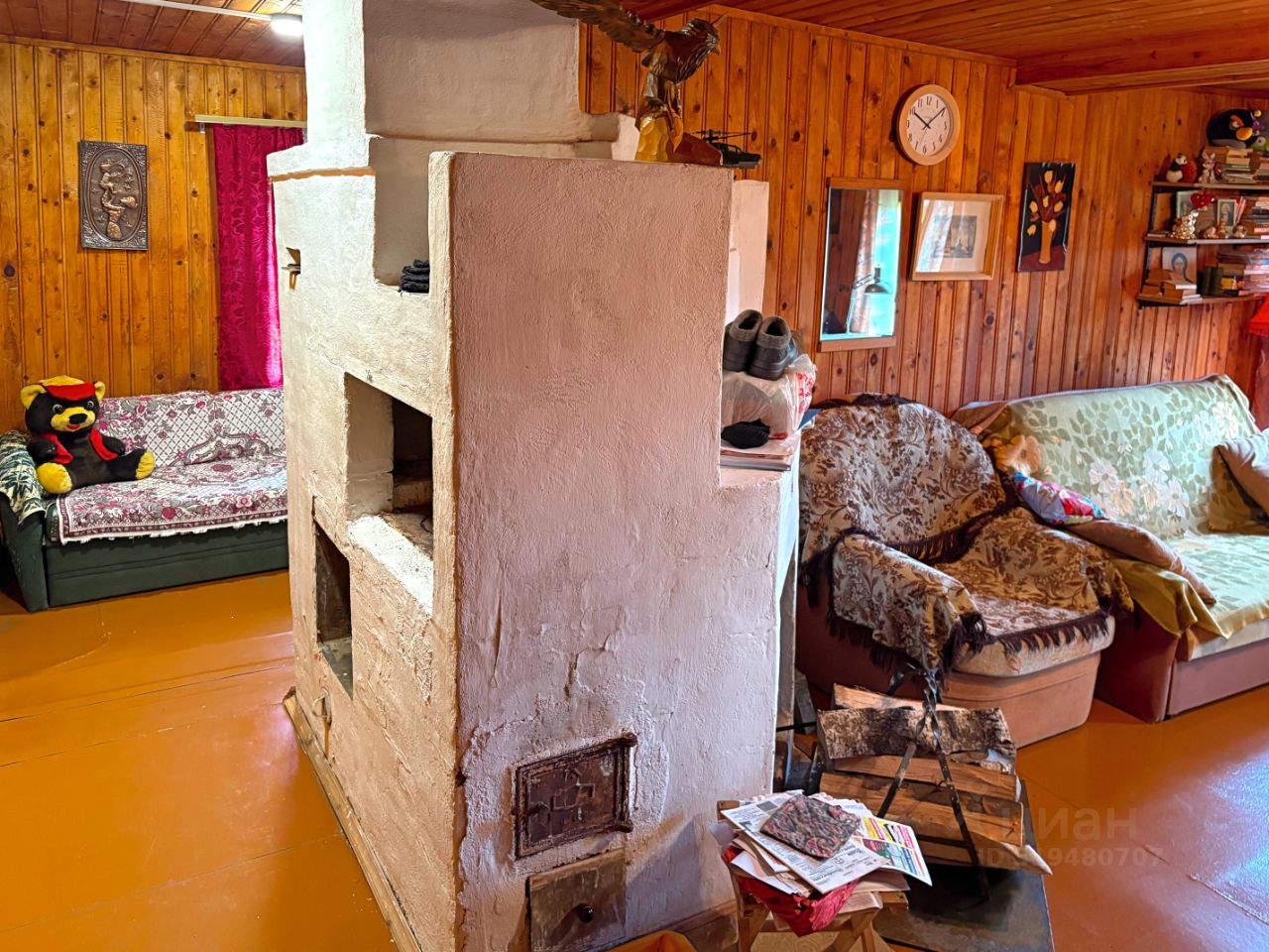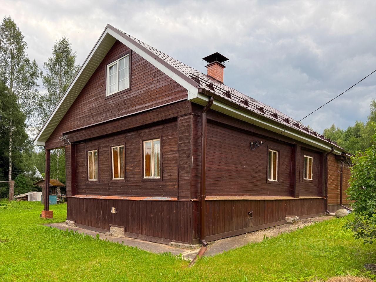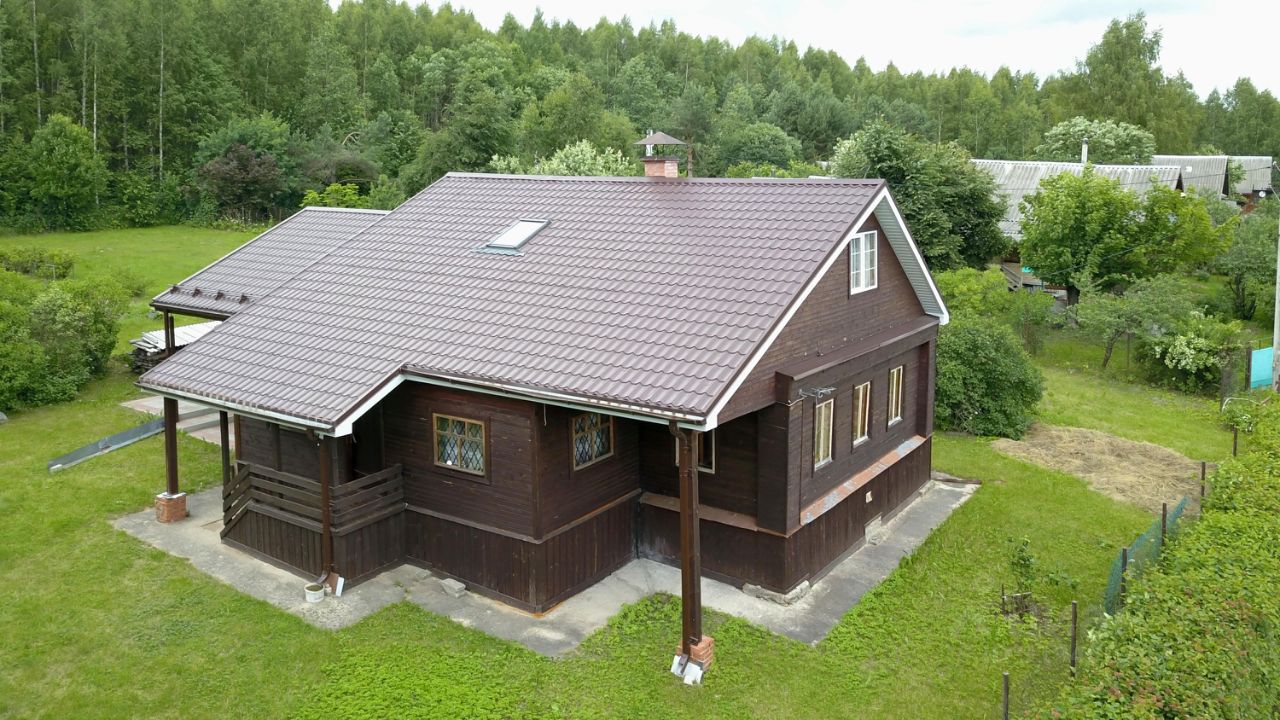 Конструктивные особенности дома: Дом - бревенчатый сруб на ленточном фундаменте, обшитый тёсом (облицовочная доска). Материал кровли - металлочерепица. Для расширения полезного пространства, на месте хоздвора сделана дополнительная утеплённая пристройка, снаружи облицованная металлическим сайдингом. Внутри пристройки сделаны входы - из основной избы и на второй этаж.