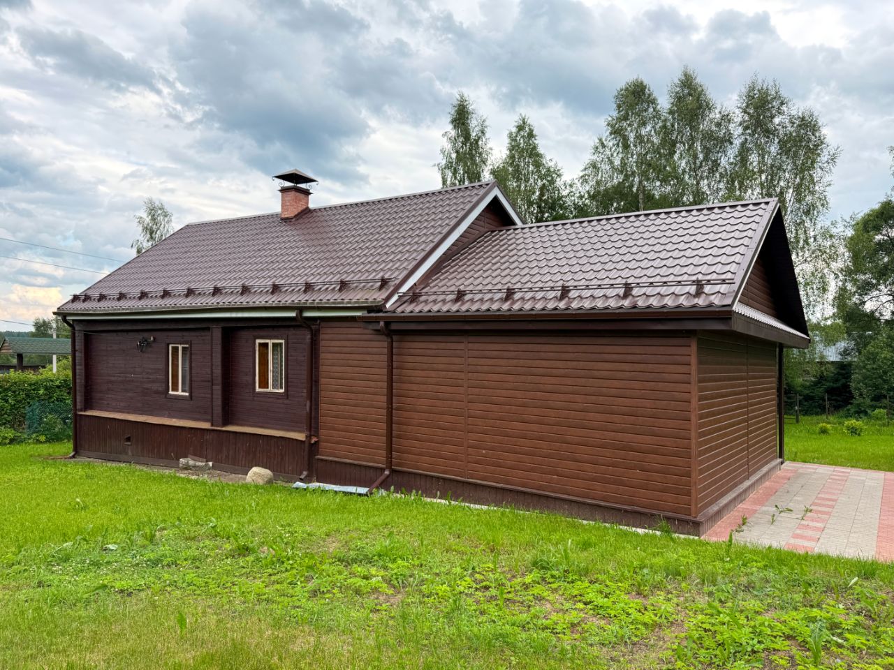 Конструктивные особенности дома: Дом - бревенчатый сруб на ленточном фундаменте, обшитый тёсом (облицовочная доска). Материал кровли - металлочерепица. Для расширения полезного пространства, на месте хоздвора сделана дополнительная утеплённая пристройка, снаружи облицованная металлическим сайдингом.