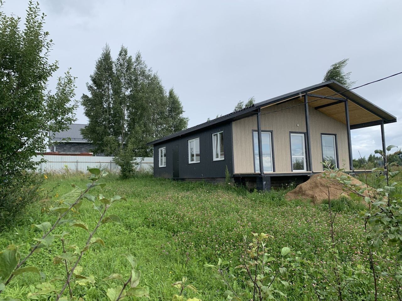 Дом построен по каркасной технологии. Фундамент - ленточный. Материал стен - сухая доска с утеплением Технониколь 200 мм. Фасад снаружи дома сделан прочным и дорогим сайдингом имитация Планкен угольного и седого цвета. крыша - деревянный конструктив, покрыт металлочерепицей 0,5 мм черного цвета Проффметалл Венеция Монтерей. Потолочные перекрытия - деревянные балки 150 мм, между балками утепление 150 мм. Холодное чердачное помещение.