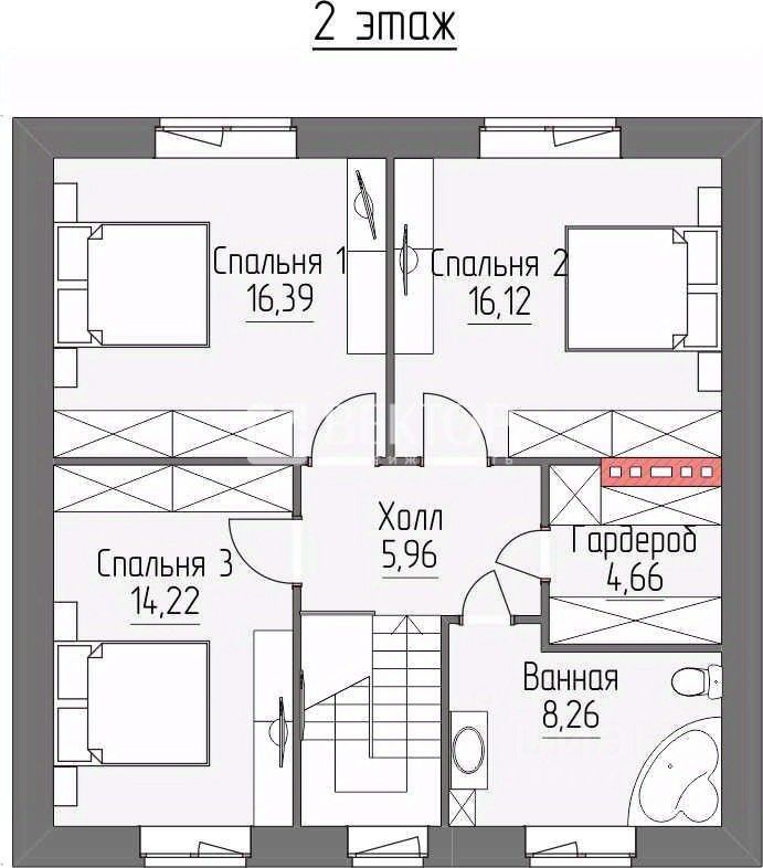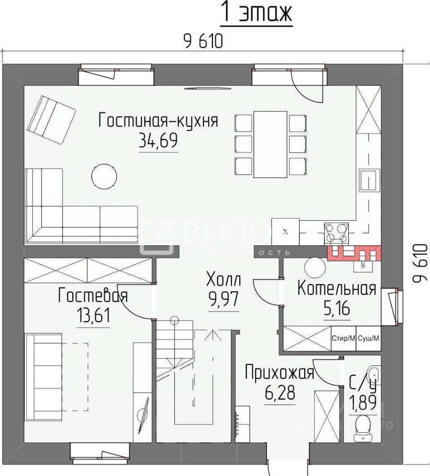Общая площадь помещений: 137,2 м. Наружный габарит дома 9.61х9.61м . Высота помещений: 1эт - 2,86м, мансардный этаж - 1,692.86м (с учетом конструкции полов).