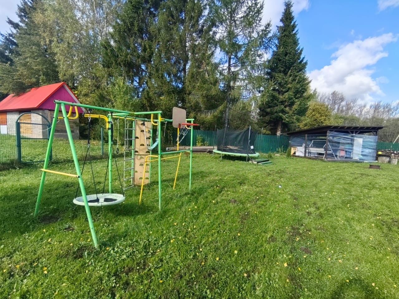 Просторный участок 17 соток. На участке есть детская площадка, теплица, плодово-ягодные насаждения, терраса.