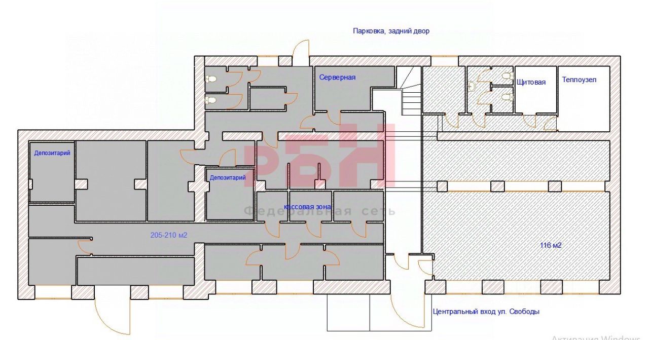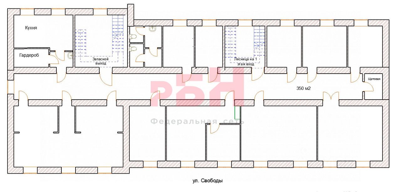 Основные характеристики объекта: Площадь: 692,6 м² 1 этаж: 341,3 м² 2 этаж: 351,3 м² (кабинетная планировка) Фасадные входы: 2 отдельных входа с фасада на улице Свободы Дополнительный вход: запасной вход во дворе здания Высота потолков: 3,4 м Много окон дает хорошее естественное освещение, в том числе большие панорамные окна на первом этаже.