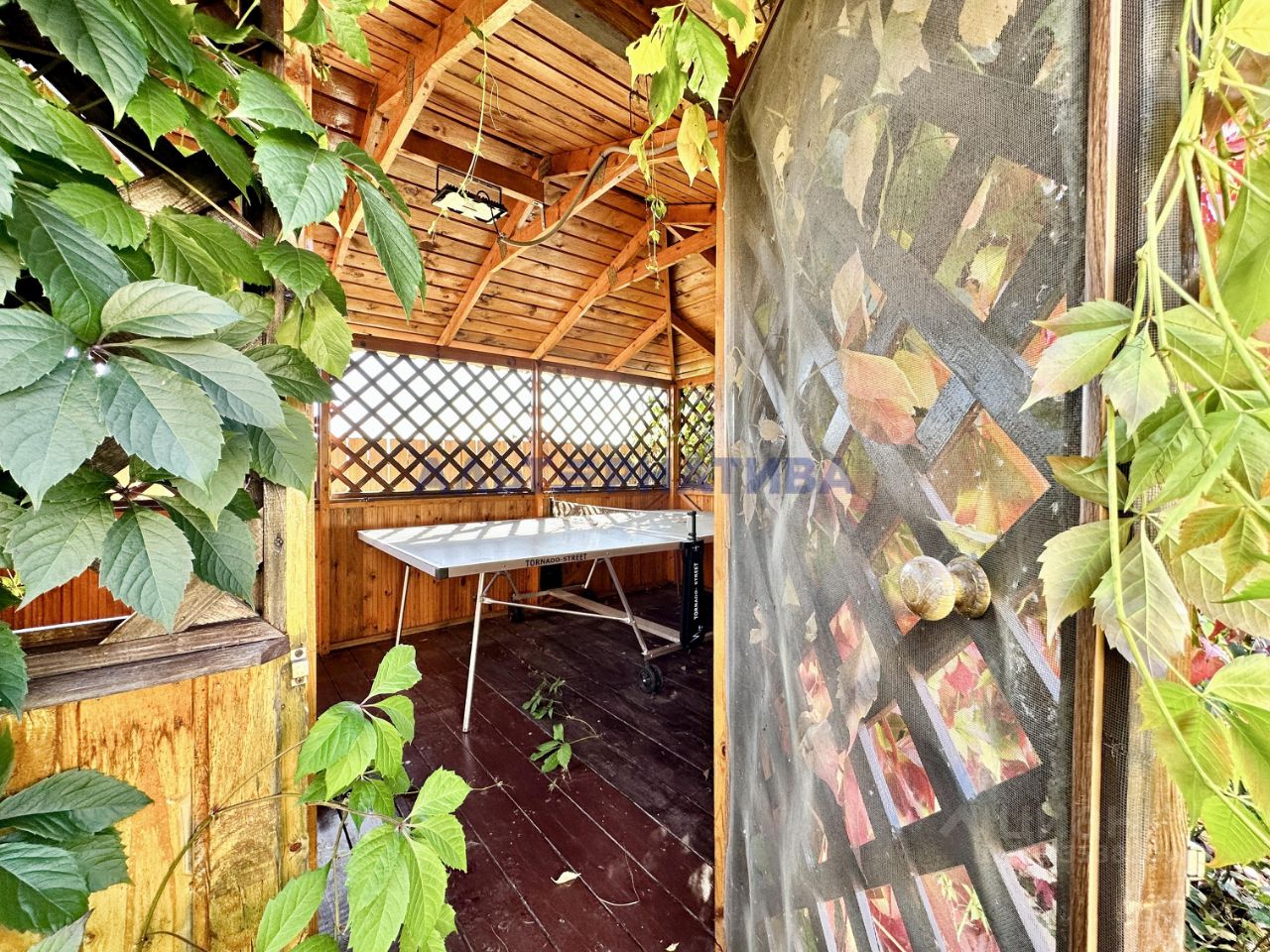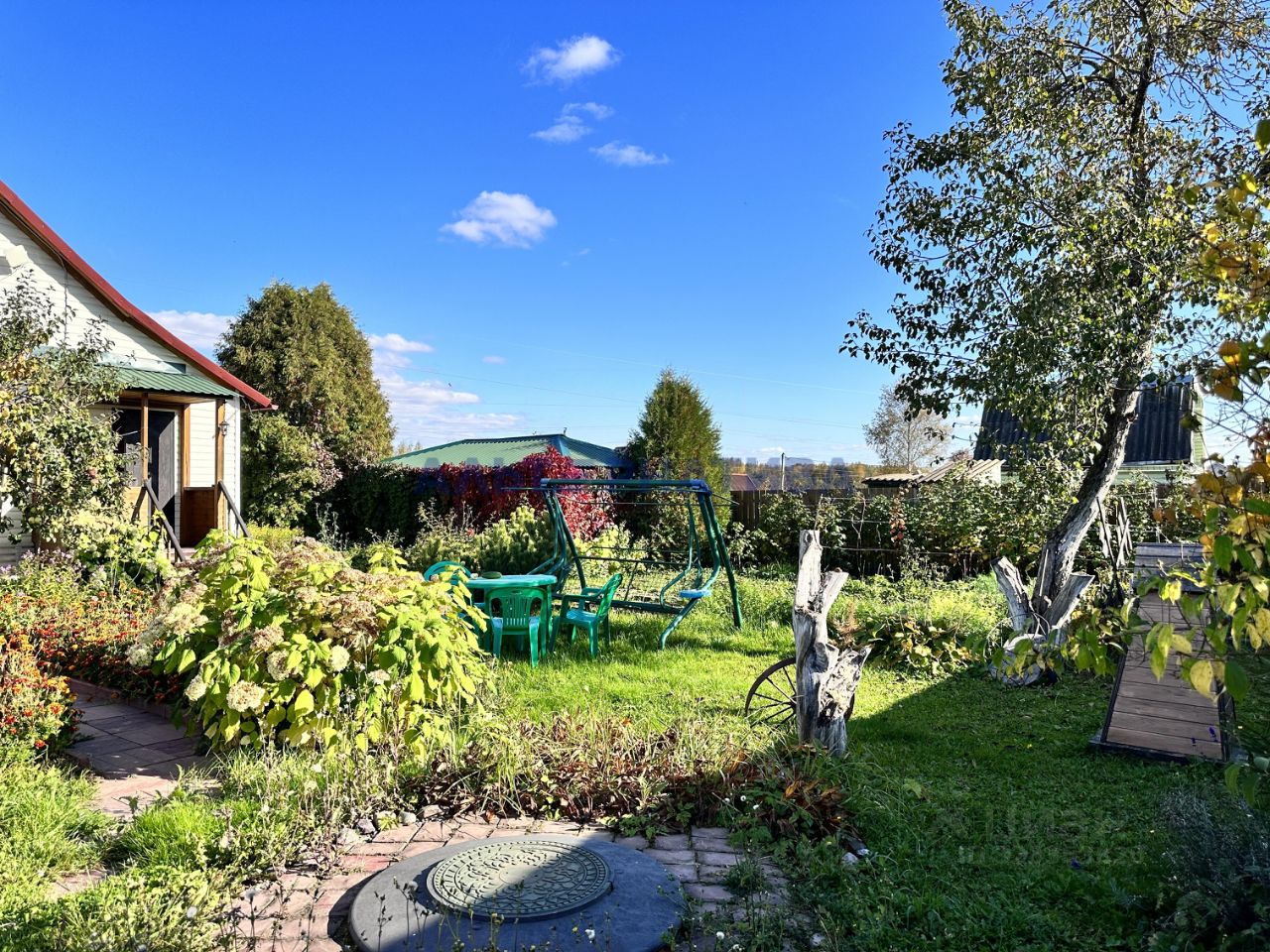 Земельный участок площадью 5.5 соток. Ухоженный, ровный, правильной формы. На участке множество кустов и плодово-ягодных насаждений, цветов. Установлены качели. Так же на участке расположена теплица, есть выводы водопровода для полива. Рядом с домом большая крытая беседка.