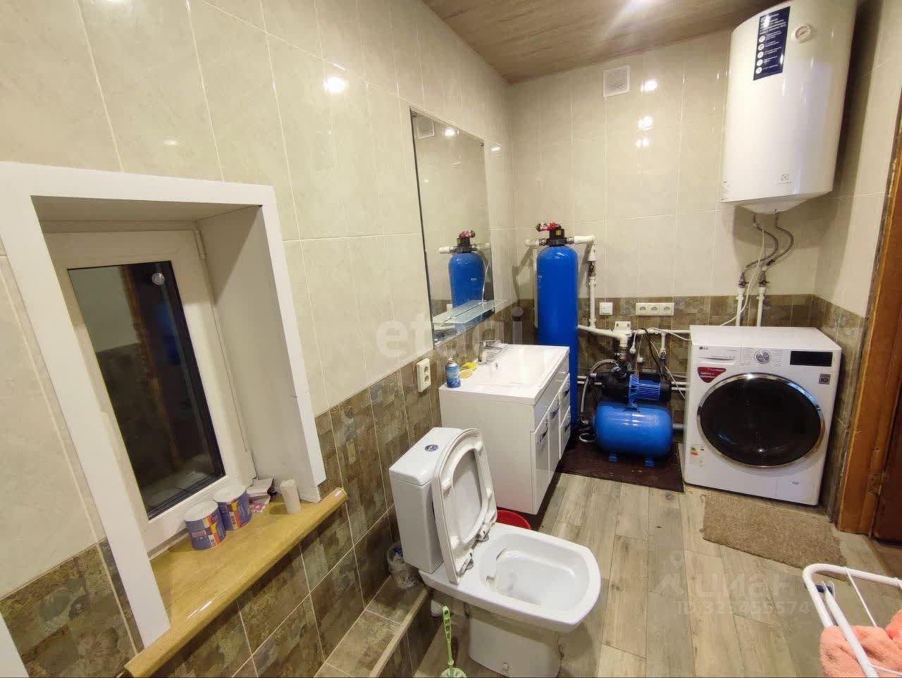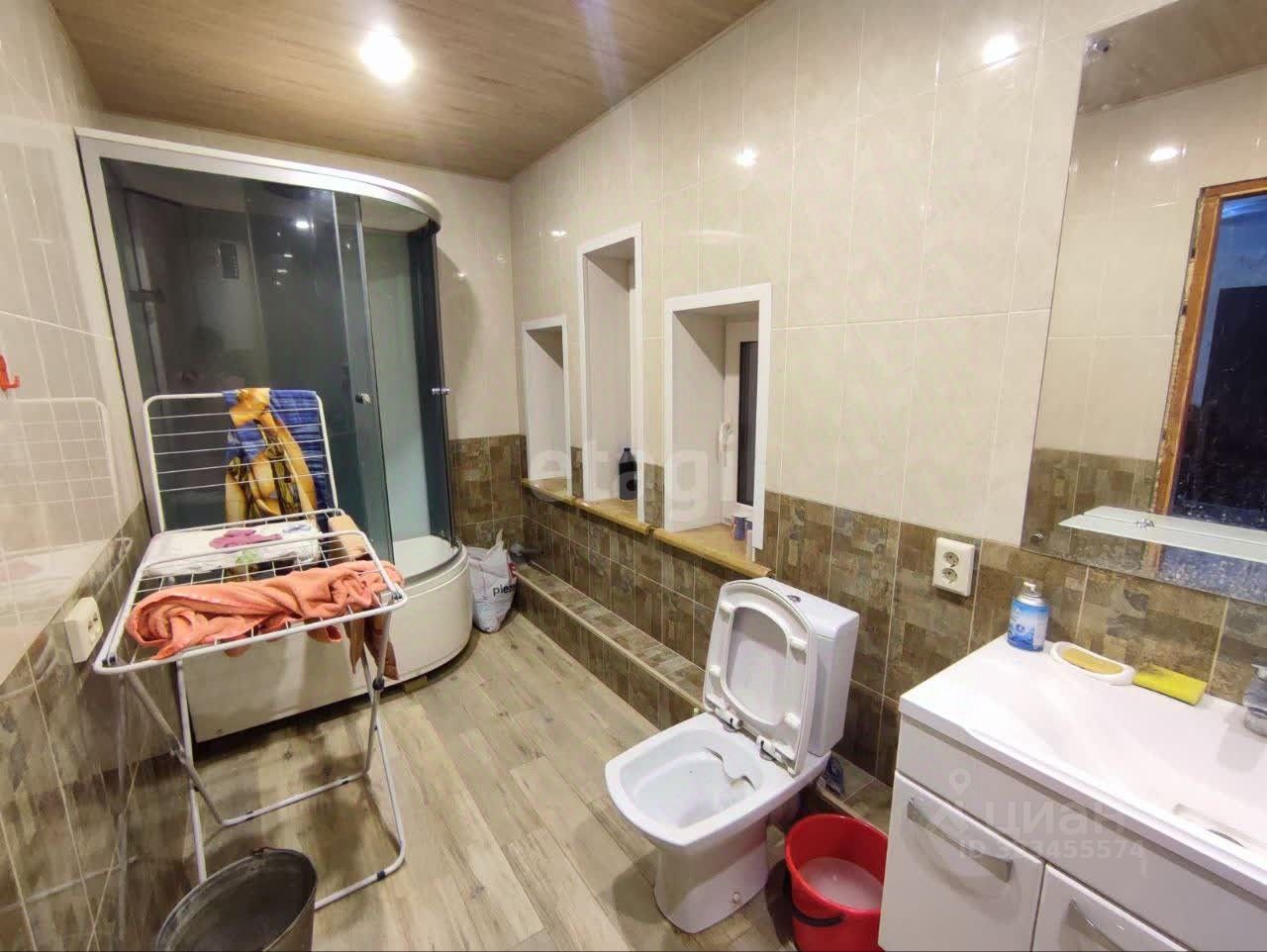 Гостиная комната обшита вагонкой, посередине стоит шведская печка. Санузел оснащен душевой кабинкой и стиральной машиной, теплый пол.