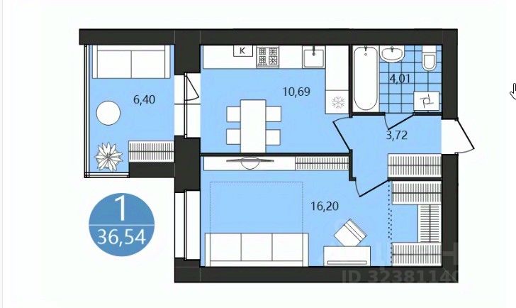 Эта светлая и функциональная 1-комнатная квартира площадью 36,54 м² идеально подойдет для современного городского жителя, ценящего каждый квадратный метр:
