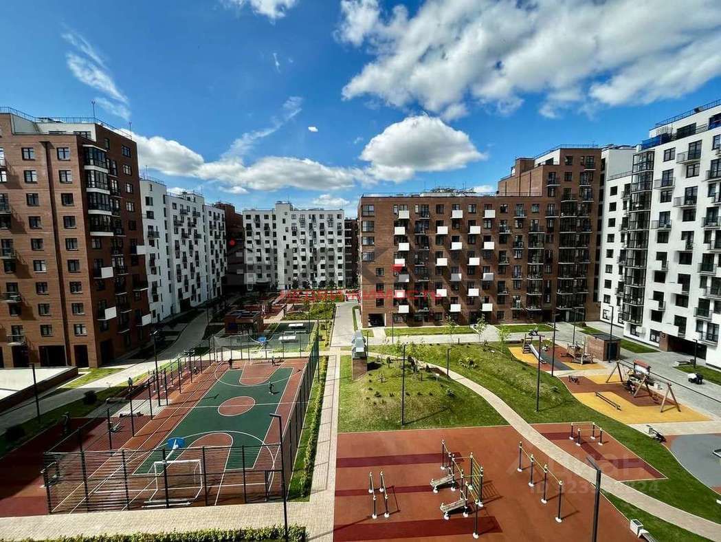 Огороженная и облагороженная территория с детским городком, тренажерами и лавочками. В доме есть подземный паркинг и два лифта в подьезде.