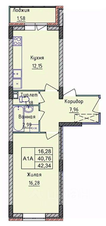 - Общая площадь квартиры 42,34 кв.м., - Современная планировка, окна выходят на 2 (две) стороны! - Удобная гостиная комната 16,28 кв.м.,