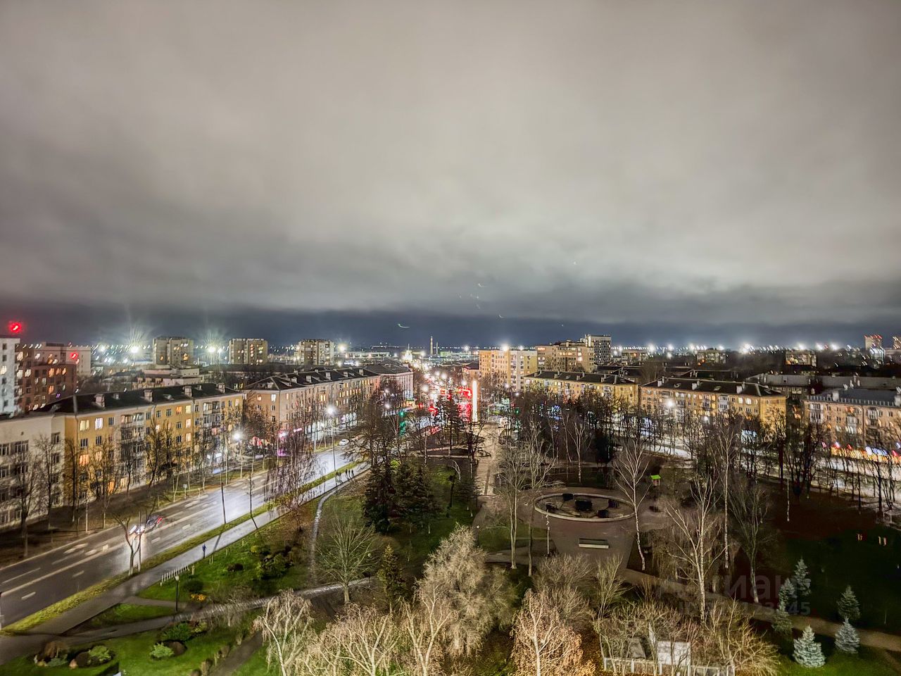 Видовые характеристики: Прямой вид на парк Мира, фонтан и вечернюю архитектурную подсветку.