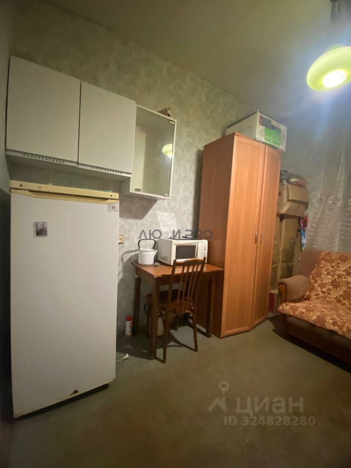 В комнате есть холодильник, диван, шкаф, стол, микроволновка.