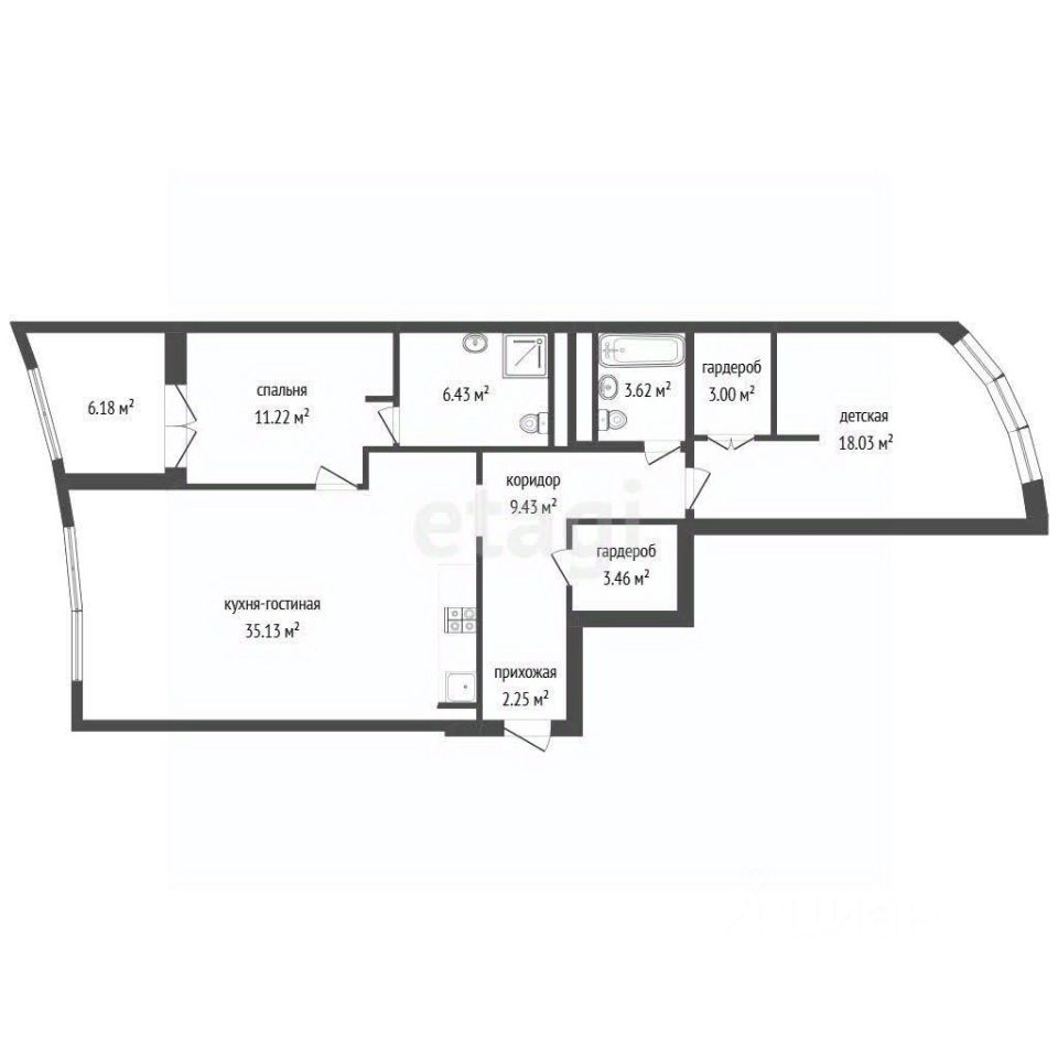 О квартире: -общая площадь 89,7 м кв, -площадь комнат 18,03 м кв и 11,22 м кв + теплая лоджия 6,18 м.кв -кухня- гостиная 35,13 м кв, -2 сан узла.