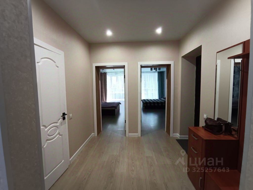 Сделан хороший ремонт, на полу ламинат, комнаты раздельно, мебель необходимая, две двуспальные кровати и диван, холодильник, печь СВЧ, стиральная машина.