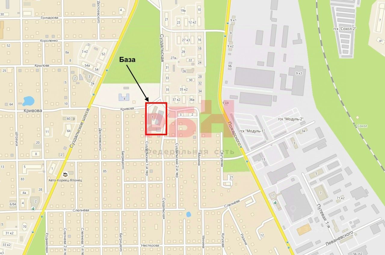 Преимущества: помещение на производственно-складской базе в 250 м от Суздальского шоссе, база расположена в центре микрорайона, территория закрытая и охраняемая, удобный подъезд на автомобиле с Суздальского шоссе и ул. Пожарского, до ближайших остановок общественного транспорта 300-600 м, 5 маршрутов, вокруг большое количество частных, а также малоэтажных жилых домов, в 500 м от базы вдоль Суздальского ш. находятся несколько многоэтажных жилых домов (9-18 этажей), ворота и широкие двери, территория позволяет грузовым автомобилям удобно маневрировать и подъезжать к местам погрузки-разгрузки, возможность выбрать наиболее подходящее помещение из нескольких, отличное состояние помещений.