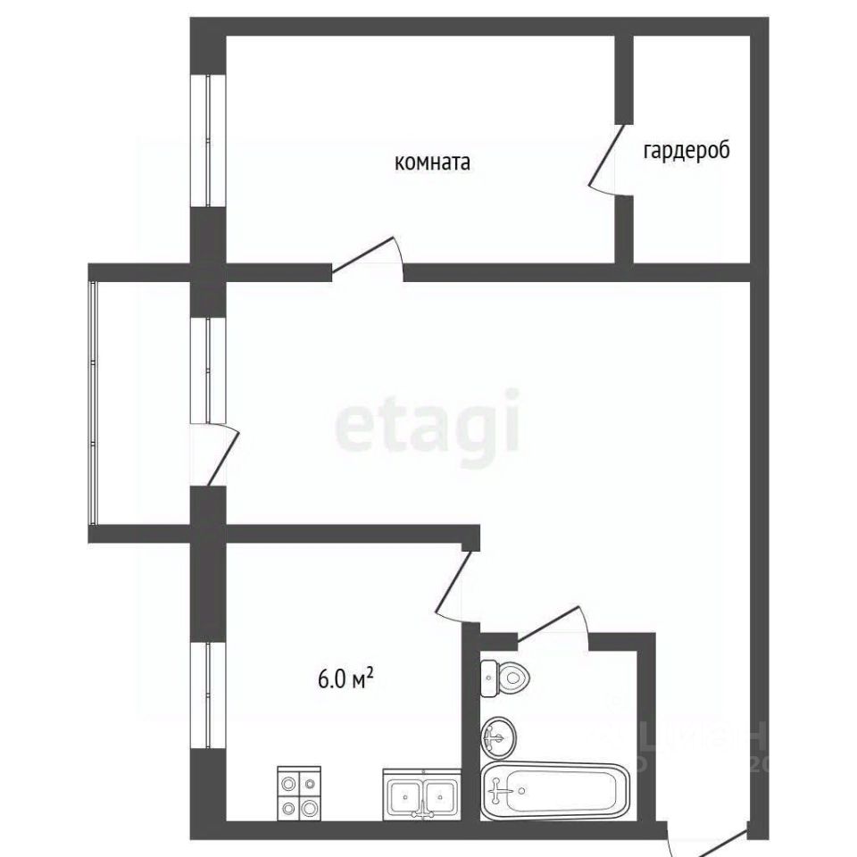 Общая площадь 42 кв. м, площадь кухни 6 кв.м