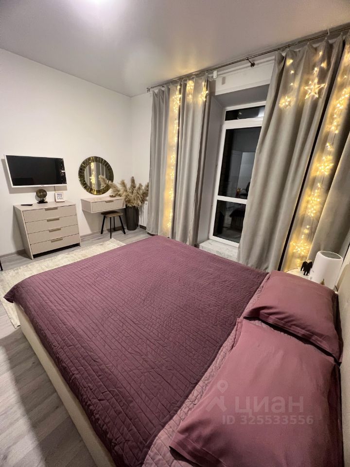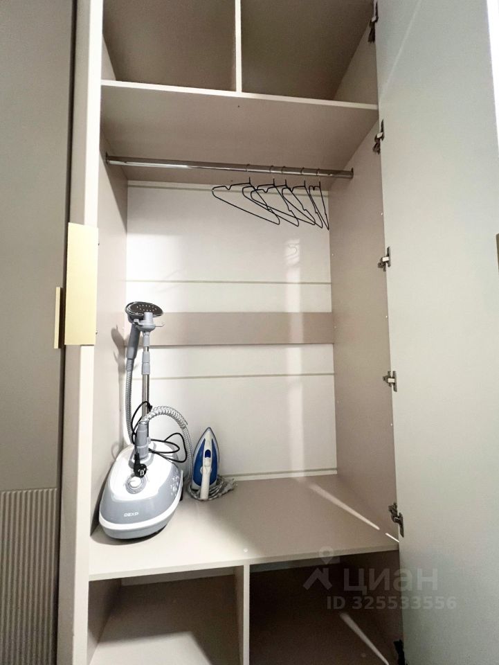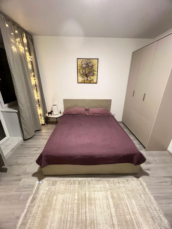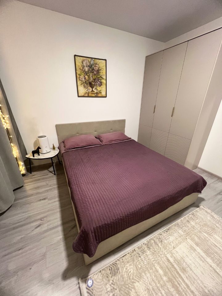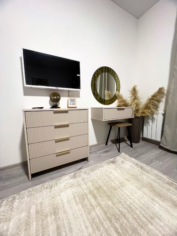 Просторная стильная спальня с большой кроватью в спокойных тонах: предусмотрено место для багажа, одежды, также отпариватель и утюг. Вся мебель новая, современная, в едином стиле. Важная деталь: увлажнитель воздуха для создания индивидуальной комфортной обстановки.