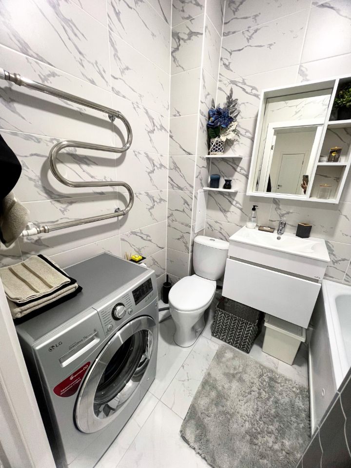 Ванная комната светлая, стильная, есть стиральная машина и полотенцесушитель, также гигиенические принадлежности и корзина для белья, арома-свечи и лампа для приятных банных и спа- процедур. Индивидуальное отопление, горячая вода есть всегда!
