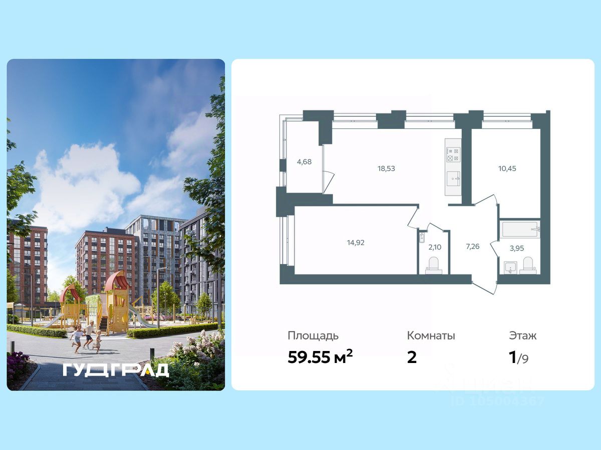 Общая площадь59,55 м2