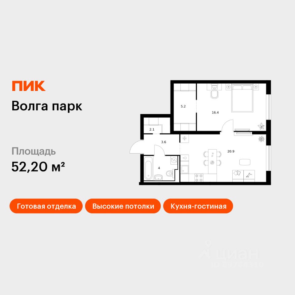 Продаётся 1-комн. квартира площадью 52,2 кв.м на 1 этаже 17 этажного дома (Корпус 2В, Секция 1) проекта ПИК Волга парк. Светлый просторный подъезд на уровне земли, функциональная планировка, большие окна, c отделкой.