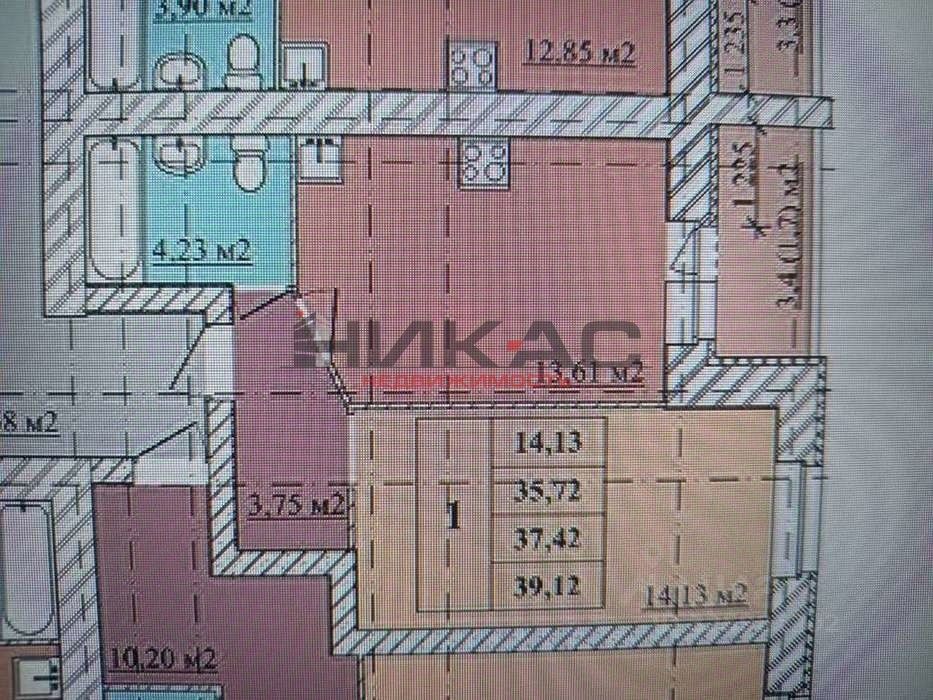 Однокомнатная квартира на 4 этаже. Общая площадь 39.12 кв.м., кухня 13, 6 кв.м. с выходом на лоджию, комната 14, 3 кв.м., прихожая с нишей, с/у совмещен. Продажа за наличные.