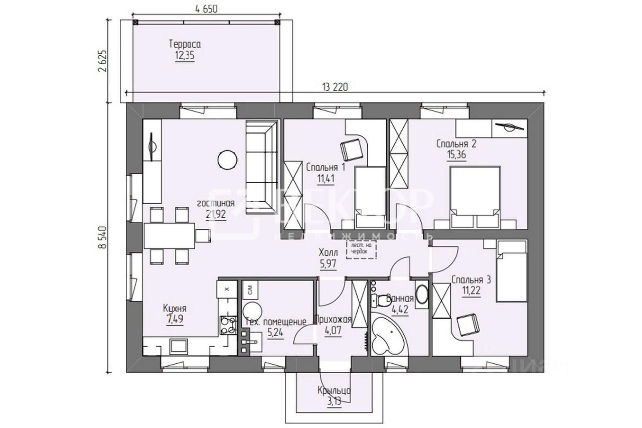 Общая площадь помещений: 87,1 м. Наружный габарит дома 13.22х8.54м. Высота помещений: 3,0м (с учетом конструкции полов).