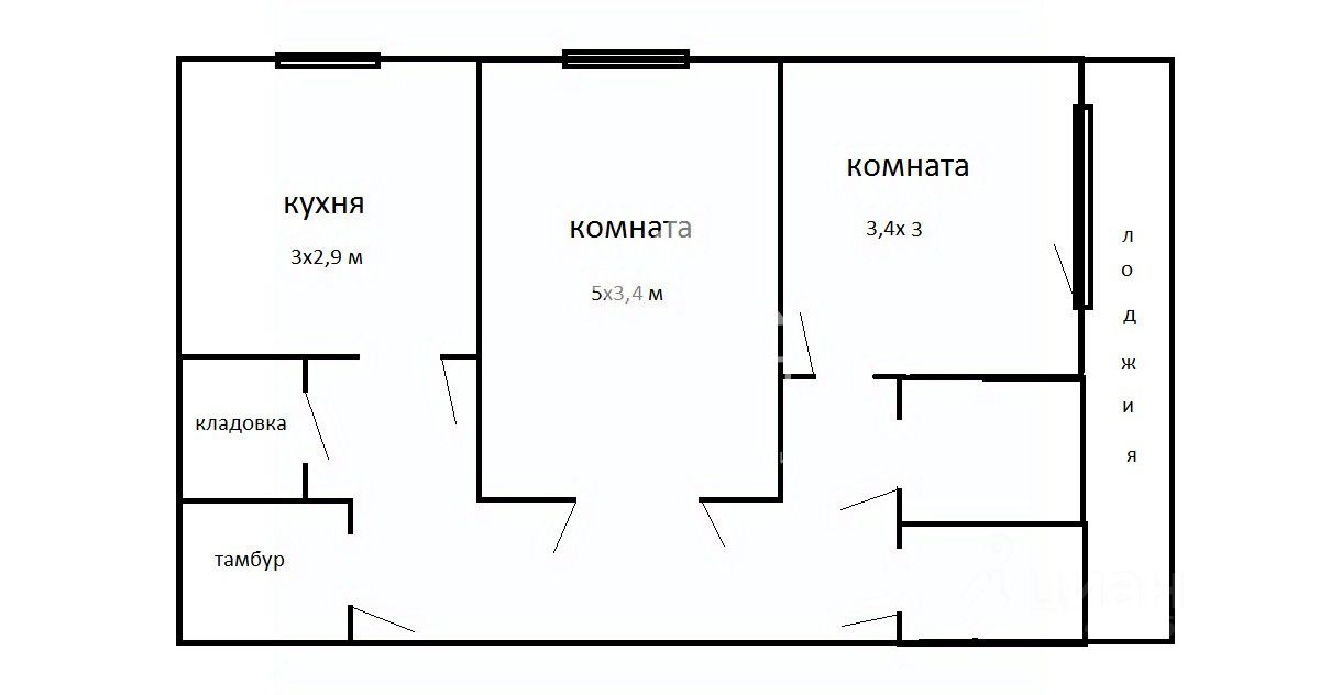 Общая площадь квартиры составляет 51,7 кв. м, из которых 27,3 кв. м — жилая площадь (17 и 10,3 кв.м), квадратная, просторная кухня 9 кв.м. Комнаты изолированы, окна выходят во двор. В квартире начат косметический ремонт: в комнате и кухне новые стеклопакеты ПВХ, в комнатах и кухне натяжные потолки, в большой комнате ламинат. Санузел раздельный. Большая лоджия вдоль всей стены квартиры.