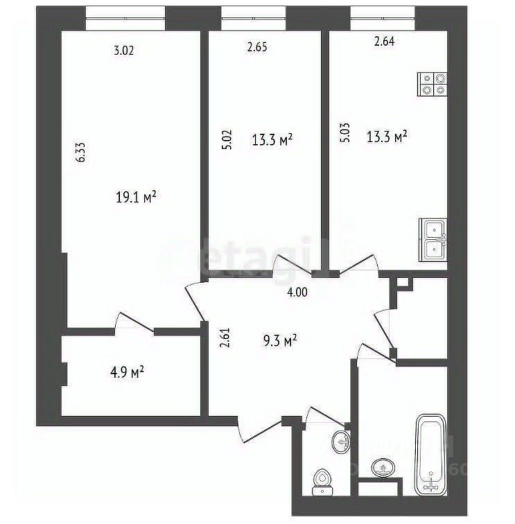 ПРО КВАРТИРУ: - Высота потолков 3,3 м создает ощущение простора - Продуманная планировка обеспечивает комфортное проживание: изолированные комнаты 19,1 и 13,3 кв.м , просторная кухня 13,3 кв.м - Мечта любой хозяйки - большая гардеробная 5 кв.м - Дополнительные удобства включают кладовку и коридор 9,3 кв.
