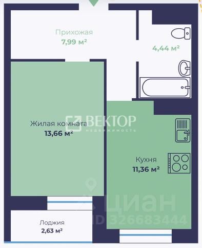 Квартира расположена на 6-м этаже 18-этажного монолитного дома. Общая площадь - 38,77 м, из которых 11,36 м приходится на просторную кухню, а 13,66 м - на жилую комнату.