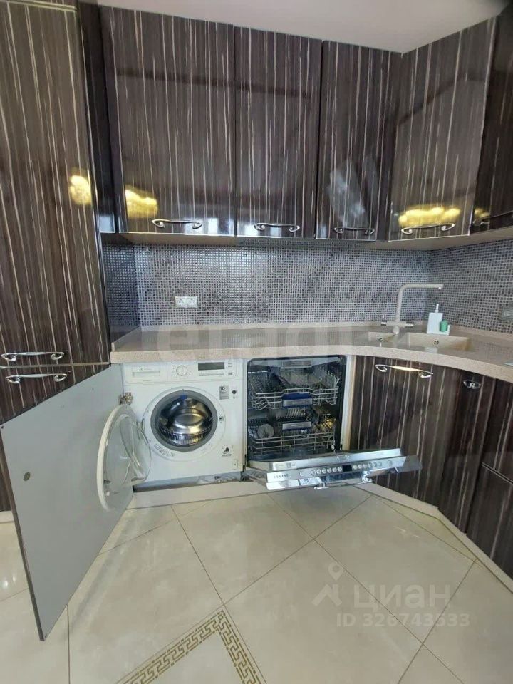 Кухня оснащена гарнитуром со встроенной техникой премиум-класса: холодильник, варочная панель, духовой шкаф, вытяжка и посудомоечная машина.
