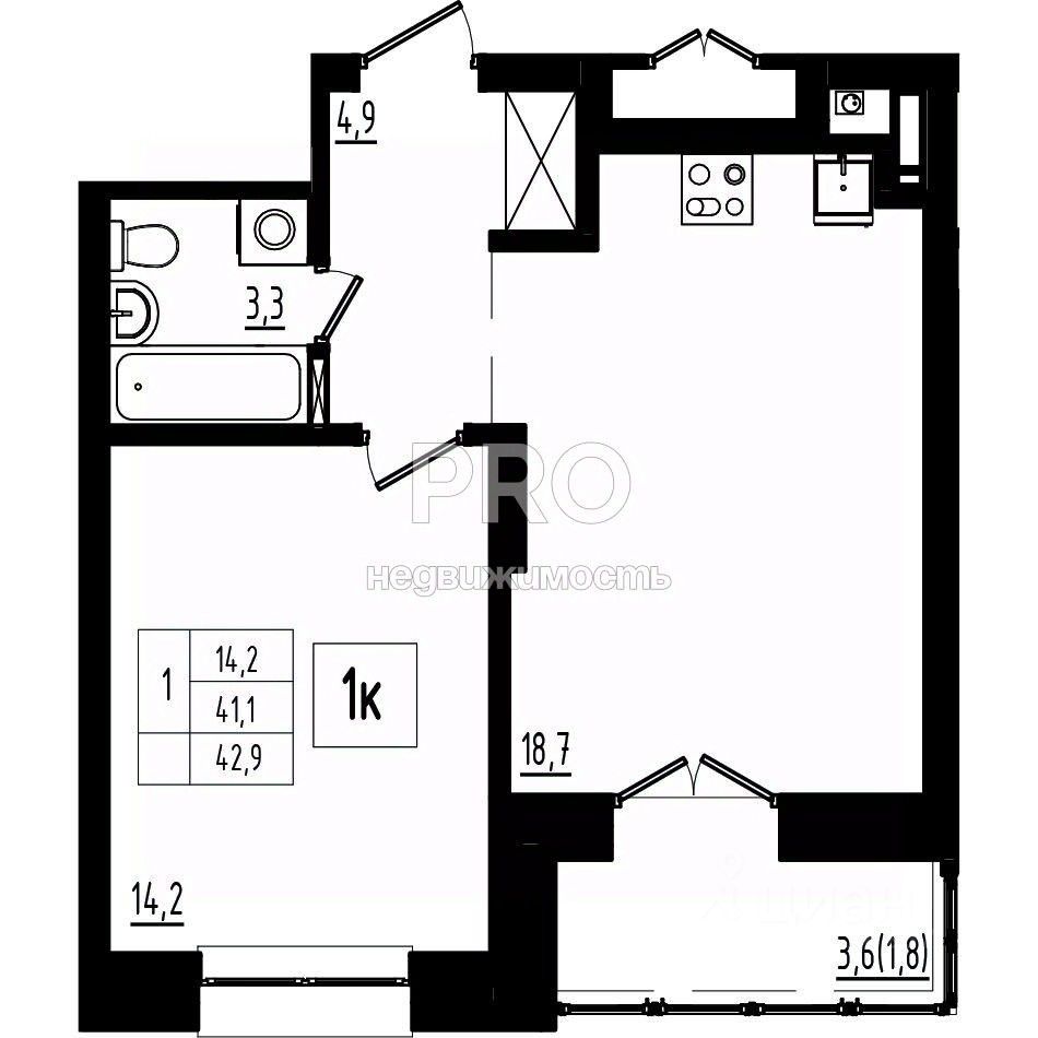 Общая площадь42,9 м2
