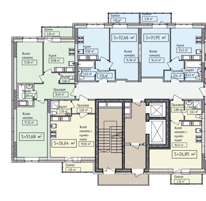 Внутренний двор комплекса благоустроен, организованы детские площадки, продуктовые магазины, парковочные места.