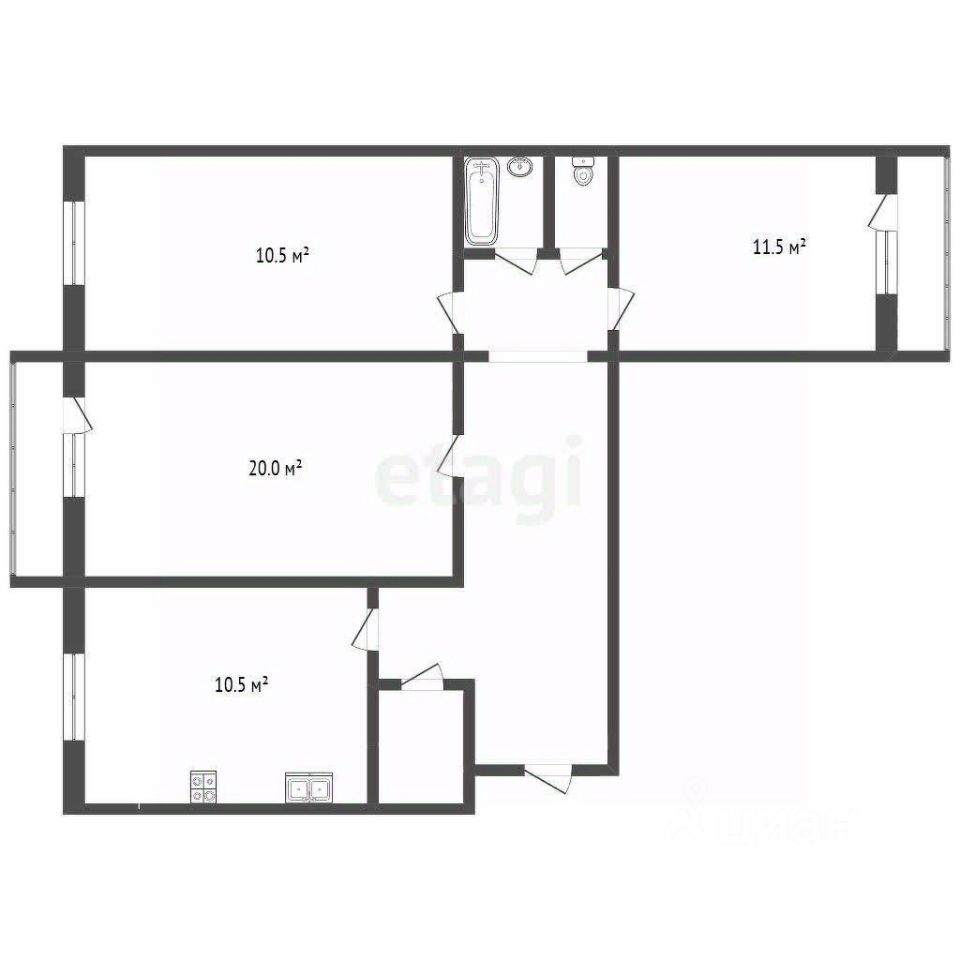 Все комнаты раздельные, правильной формы. Гостиная 20 м., спальни 10,5 и 11,5 кв. м, а это позволяет удобно расположить мебель. Кухня площадью 10,5 кв. м. станет отличным местом для кулинарных экспериментов и совместных семейных ужинов. Кухонный гарнитур с варочной поверхностью останутся новым собственникам. Так же останется практически вся мебель, кроме кроватей. Санузел раздельный, что является плюсом для большой семьи. 2 балкона застеклены. В ванной комнате установлена душевая кабина.