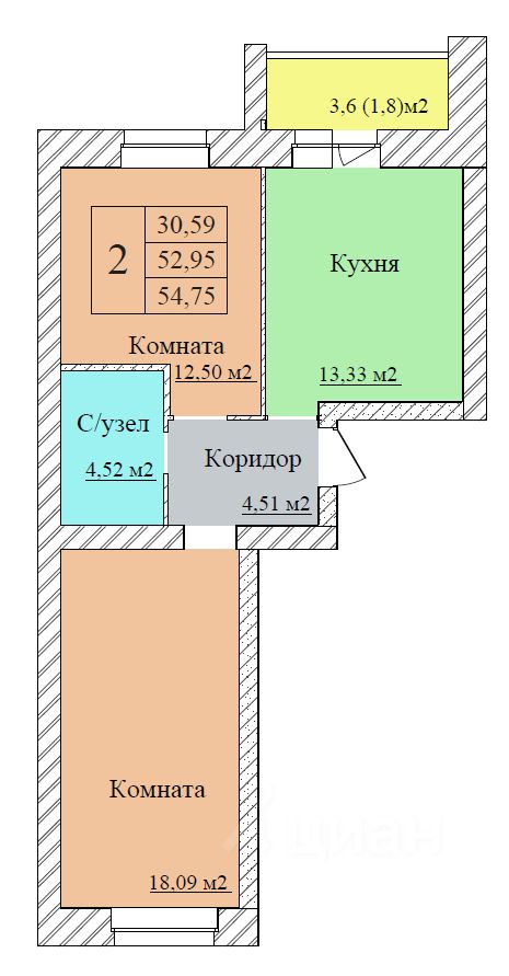 Общая площадь54,75 м2