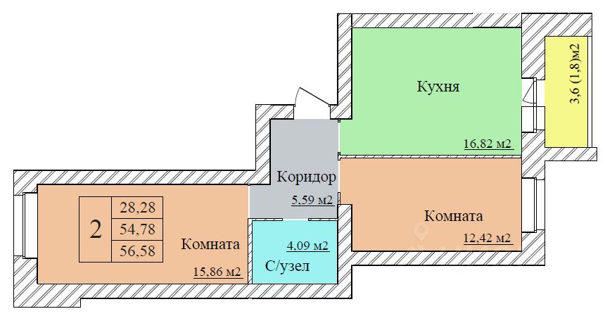 Общая площадь56,58 м2